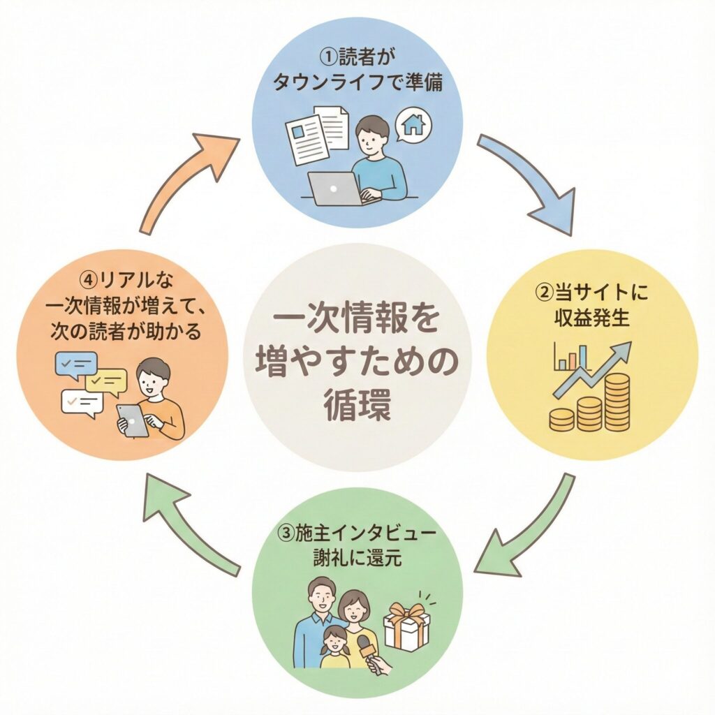 - 当サイト経由で申込みがあると収益が発生し、その収益を施主インタビューの謝礼に充てて、リアルな情報を増やすサイクルを回しているから