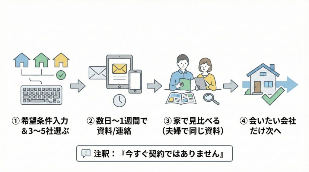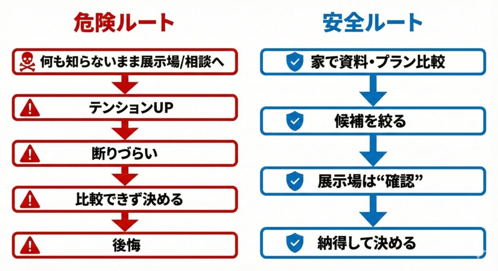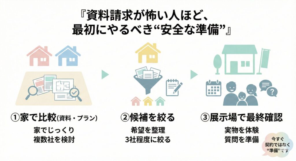「資料で比較 → 候補を絞る → 展示場で最終確認」にすると、流されにくくなります。