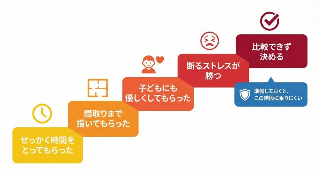 自分たちは「見学」のつもりでも、営業さんからすると「わざわざ足を運んでくれた本気のお客さま」に見えるから。