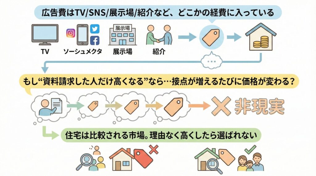 住宅会社の広告費って、テレビCMでもSNSでも紹介でも展示場でも、どこかに経費として入っているのが普通です。