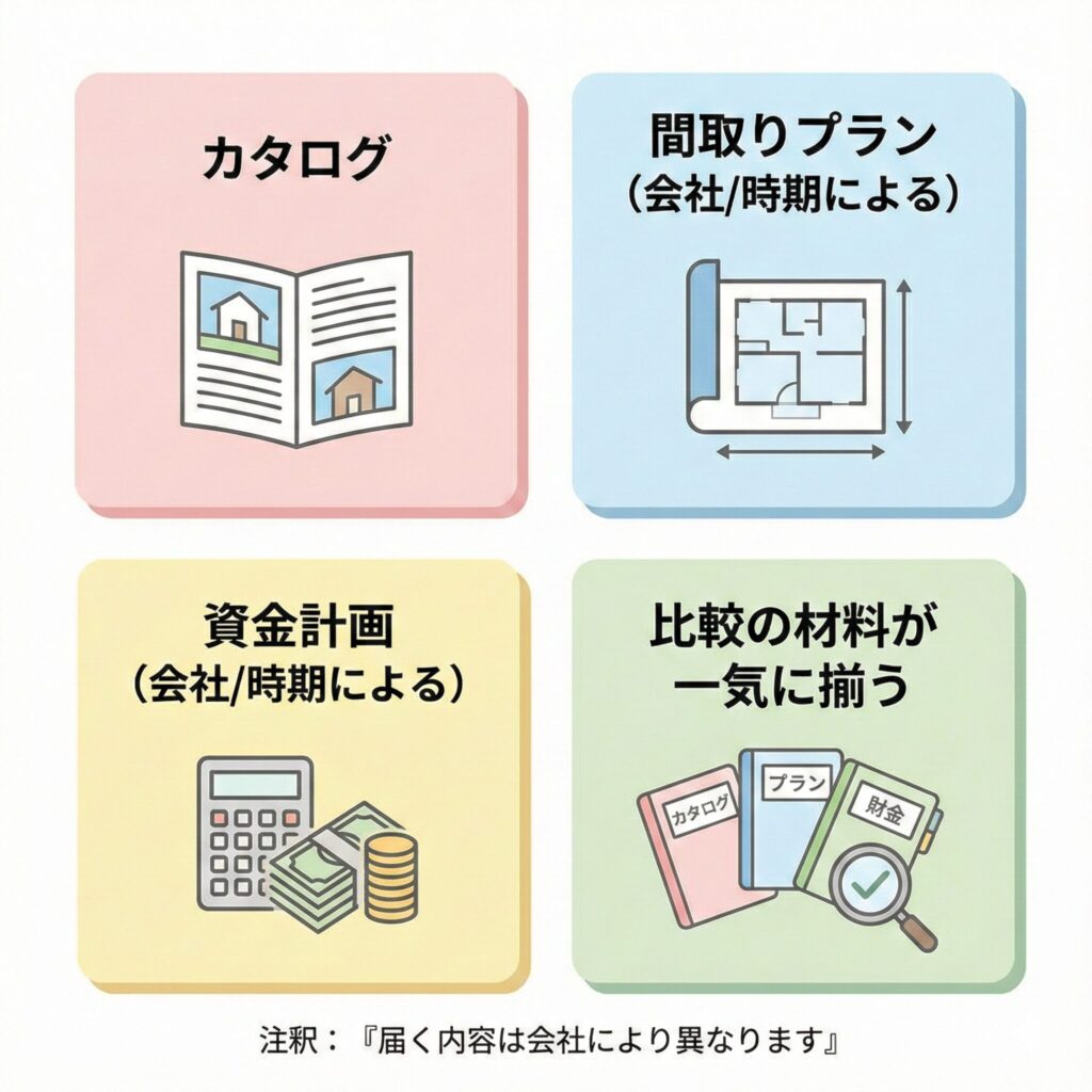 カタログだけじゃなく間取りプランや資金計画まで届いたという声もあります(会社や時期によります)。